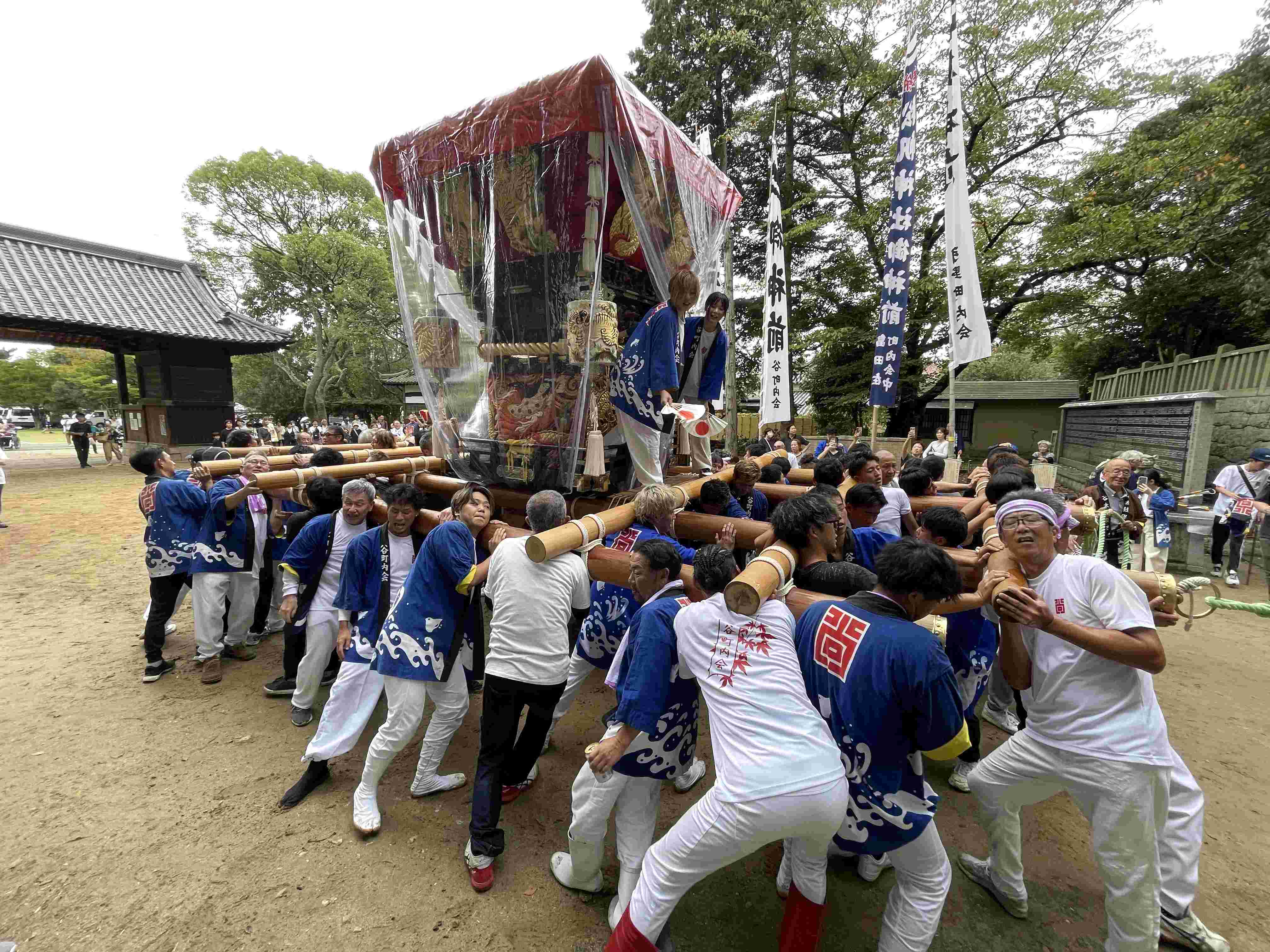 今年令和7年は例大祭前日の土曜日から雨模様となり、当日も従来通り斎行されるか危惧される状況でした。例大祭の本殿神事が執り行われた11時頃にはまとまった雨も降り、祭りの華である布団太鼓の宮入りの実施も危ういかと思われましたが、大神様のご配慮あってか雨は昼前には止み、無事に全ての例大祭行事を執り行う事が出来ました。