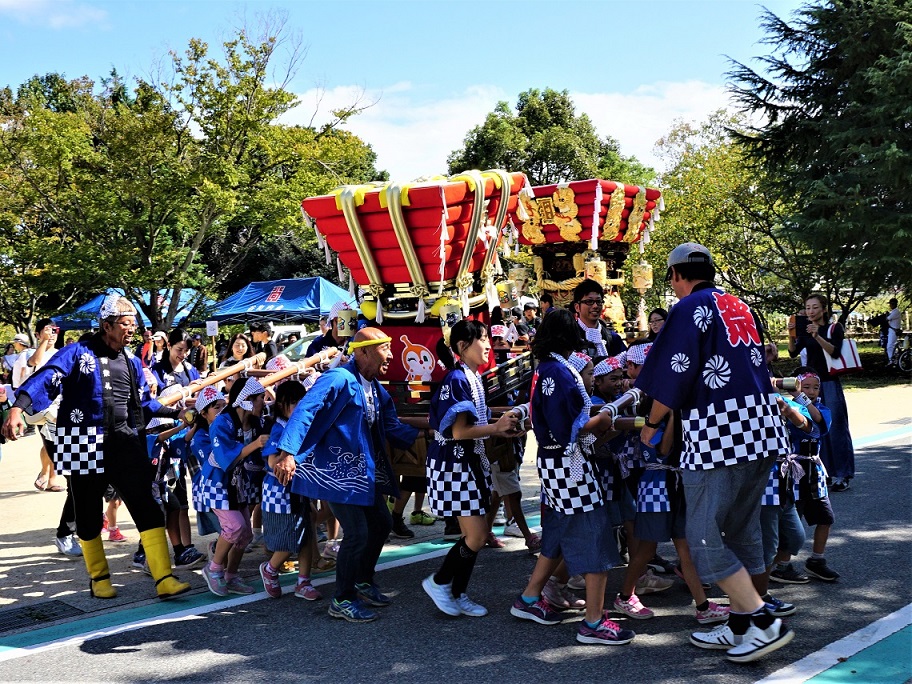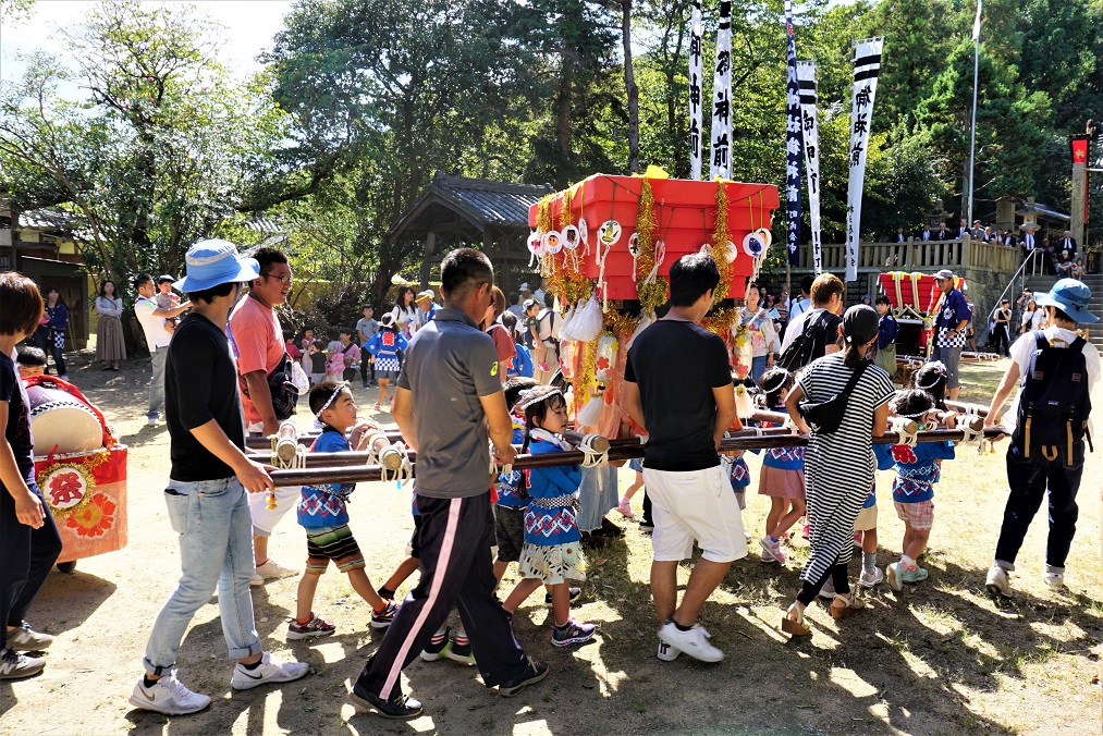 当日は素晴らしい秋晴れに恵まれ、特別に宮入りを披露いただいた戎ノ丁町内会や初めての宮入りを行った地元・畠田在町内会こども会のご参加というトピックもあって、大変な盛況の中での例大祭となりました。