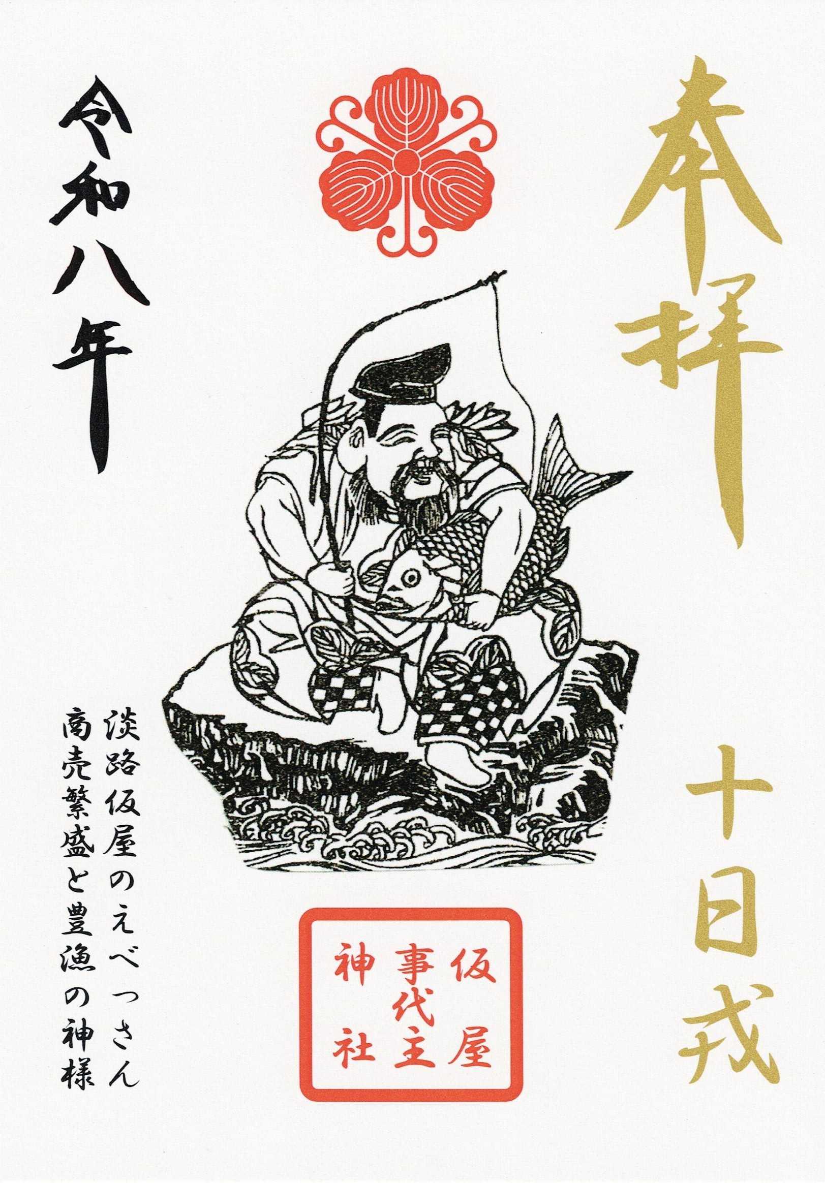 令和8年十日戎特別御朱印を数量限定で頒布いたします 仮屋事代主神社の十日戎恒例となって参りましたが、今年も限定御朱印を50体限定で頒布いたします。 吉兆(授与品)と同じ社頭の売り場にて取り扱っております。福娘さんか売り場係員にお問合せ下さい。 特別御朱印の初穂料は500円となります。 <令和8年度 仮屋事代主神社 十日戎限定御朱印> 限定50体 ※頒布終了の際は何卒ご容赦下さい