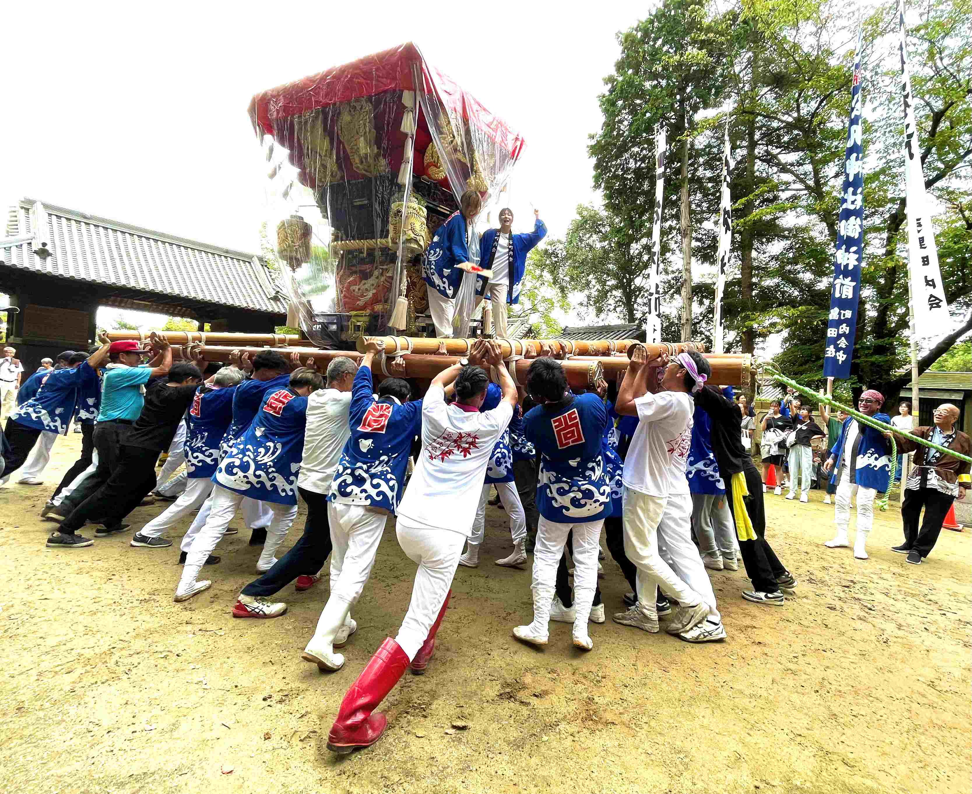 一旦神社の鳥居を出て御神前に向けて進みながら神社境内ところ狭しと練りを披露していただき、「チョーサジャ」の掛け声、そして太鼓を差し上げる際の「サッセーサッセーチョーサ!」の掛け声が響き祭りの熱気も最高潮となりました。