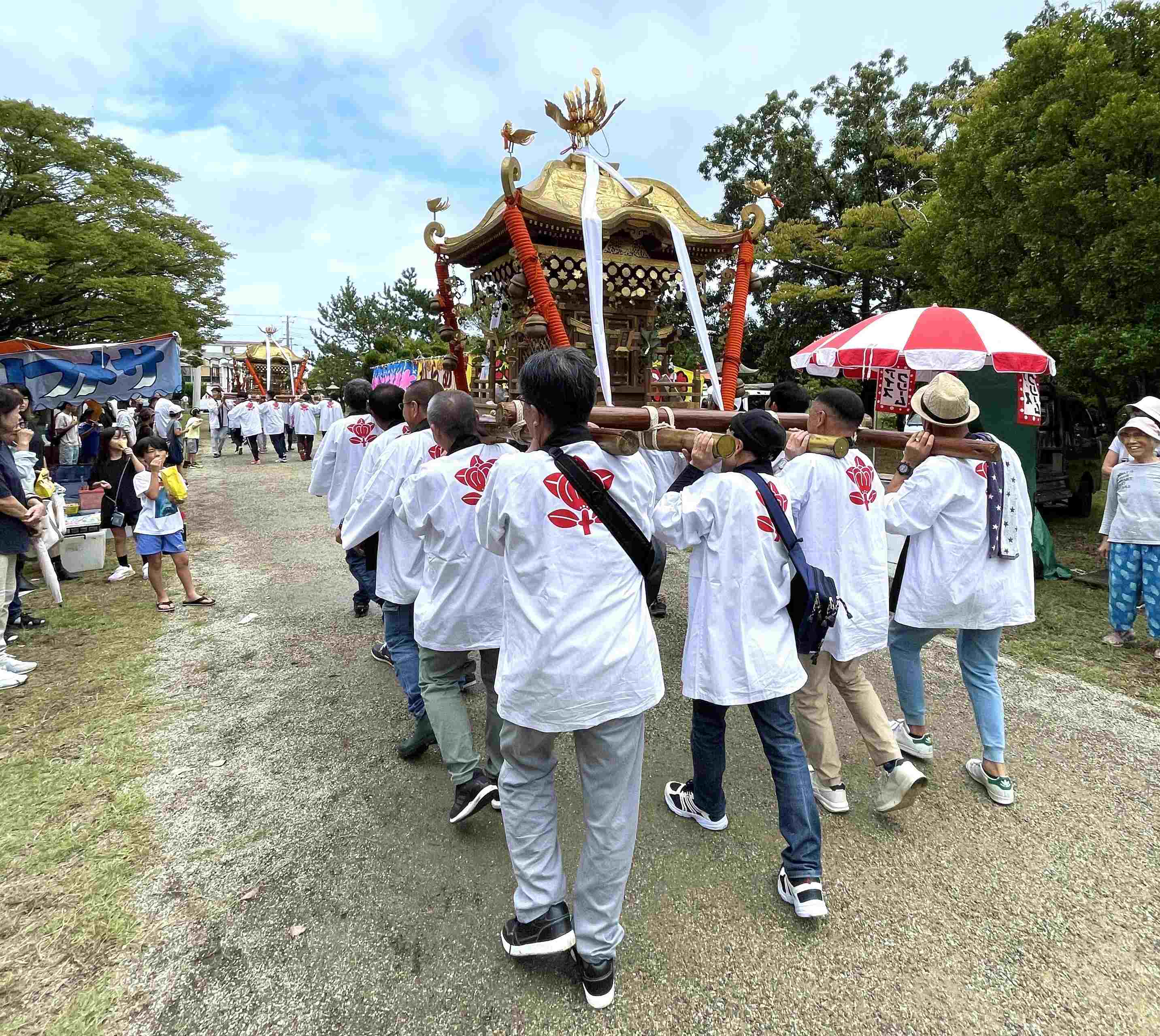 例大祭を締めくくる神幸祭を国道28号線脇の御旅所にて執り行いました。御神体を奉安した神輿を担ぐのは初老(数え42歳の大厄)及び還暦(数え61歳の厄年)の方々です。この頃には雲間から薄日も差し、少々暑い程の天候となりました。